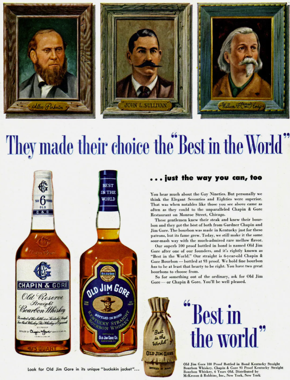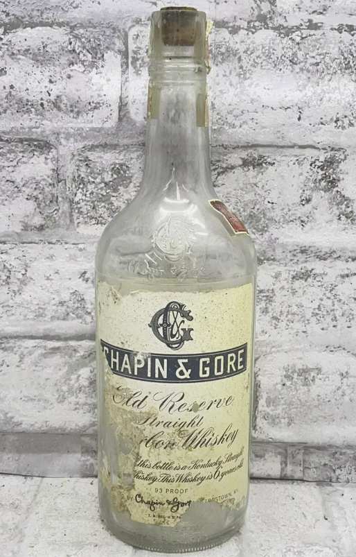 After Jim Gore died in 1891, Chapin carried on and the firm’s ads continued to claim that Old Jim Gore Sour Mash Whiskey was “the best in the world.” Chapin was forced to shut down all alcohol related aspects of the enterprise as a result of National Prohibition. As a brand name, however, Chapin and Gore was revived after Repeal in 1934. At first it was produced by the National Distillers Corporation of Louisville which had nearly 140 brand names under its control. Subsequently it was sold to one of the Bardstown distilleries which produced it under the somewhat misleading label: “Distilled by Chapin and Gore.”