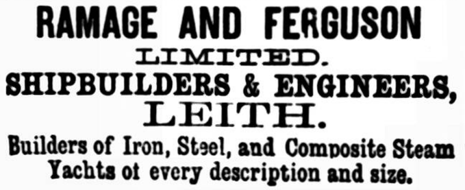 Ramage & Ferguson was a Scottish shipbuilder active from 1877 to 1934, who specialised in luxury steam-yachts usually with steel hulls and timber decks. The company was formed in May 1877 in the outer harbour area of the Water of Leith on the west side of the Shore in Leith, backing onto the then relatively new Victoria Dock. Ships were launched into the Water of Leith, greatly limiting the maximum size of ship capable of launch. Production moved from iron to steel in 1880 and major expansions were made in 1892.