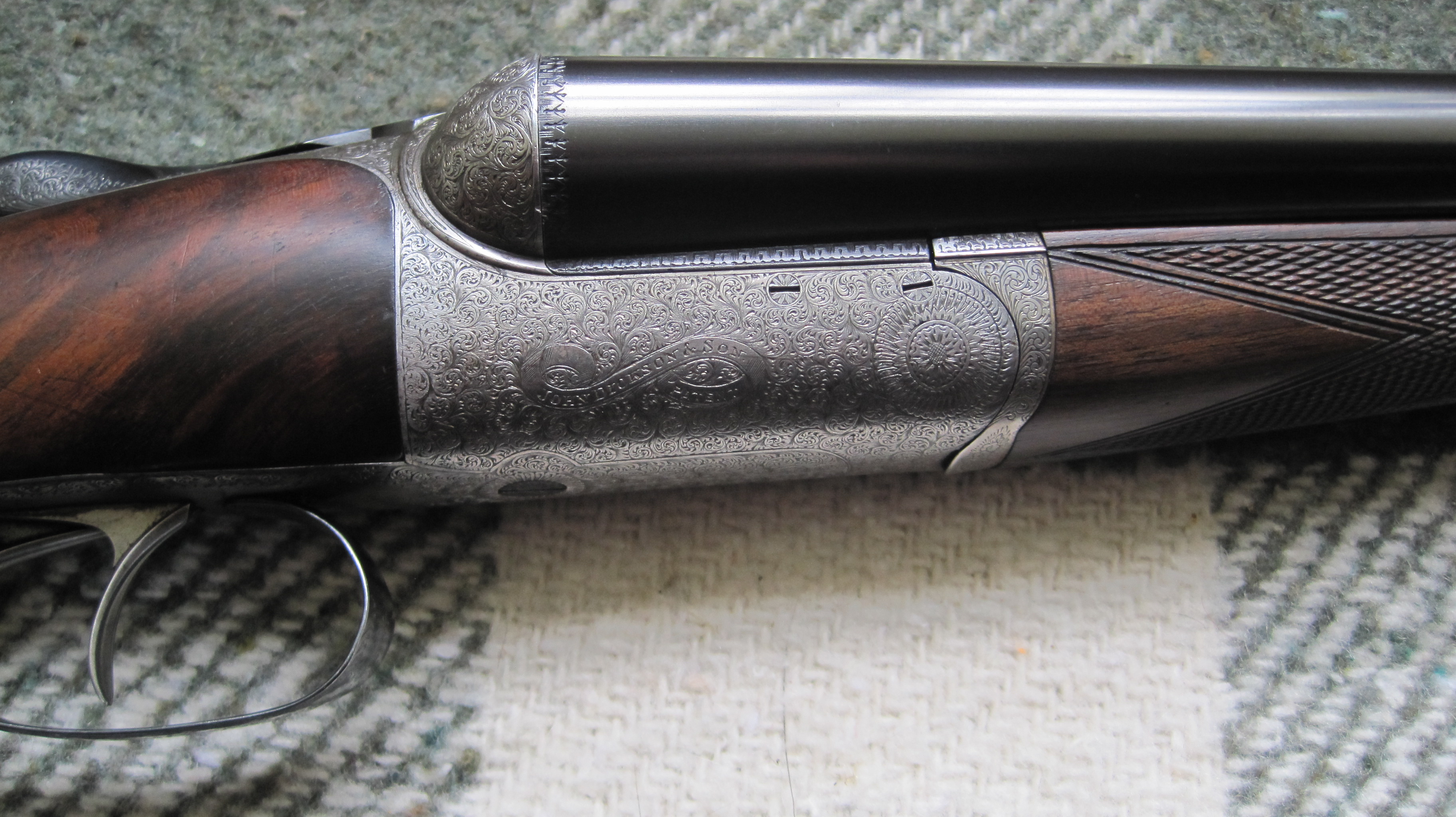 - John Dickson & Son Round-Action - Built 1894, 12 gauge, beautiful 29in damascus barrels